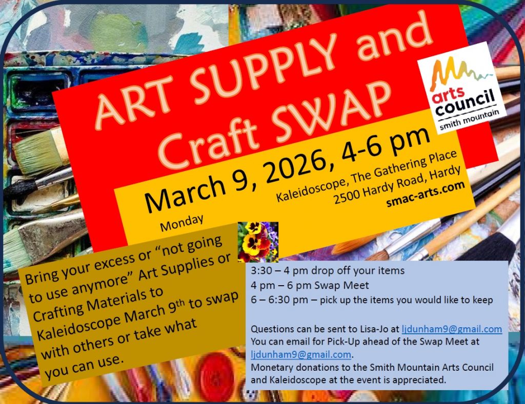 If you leave your items after 6:30 pm on March 9th, they will become the possessions of the Smith Mountain Arts Council or Kaleidoscope for use or disposal at their discretion unless an agreement is previously made.